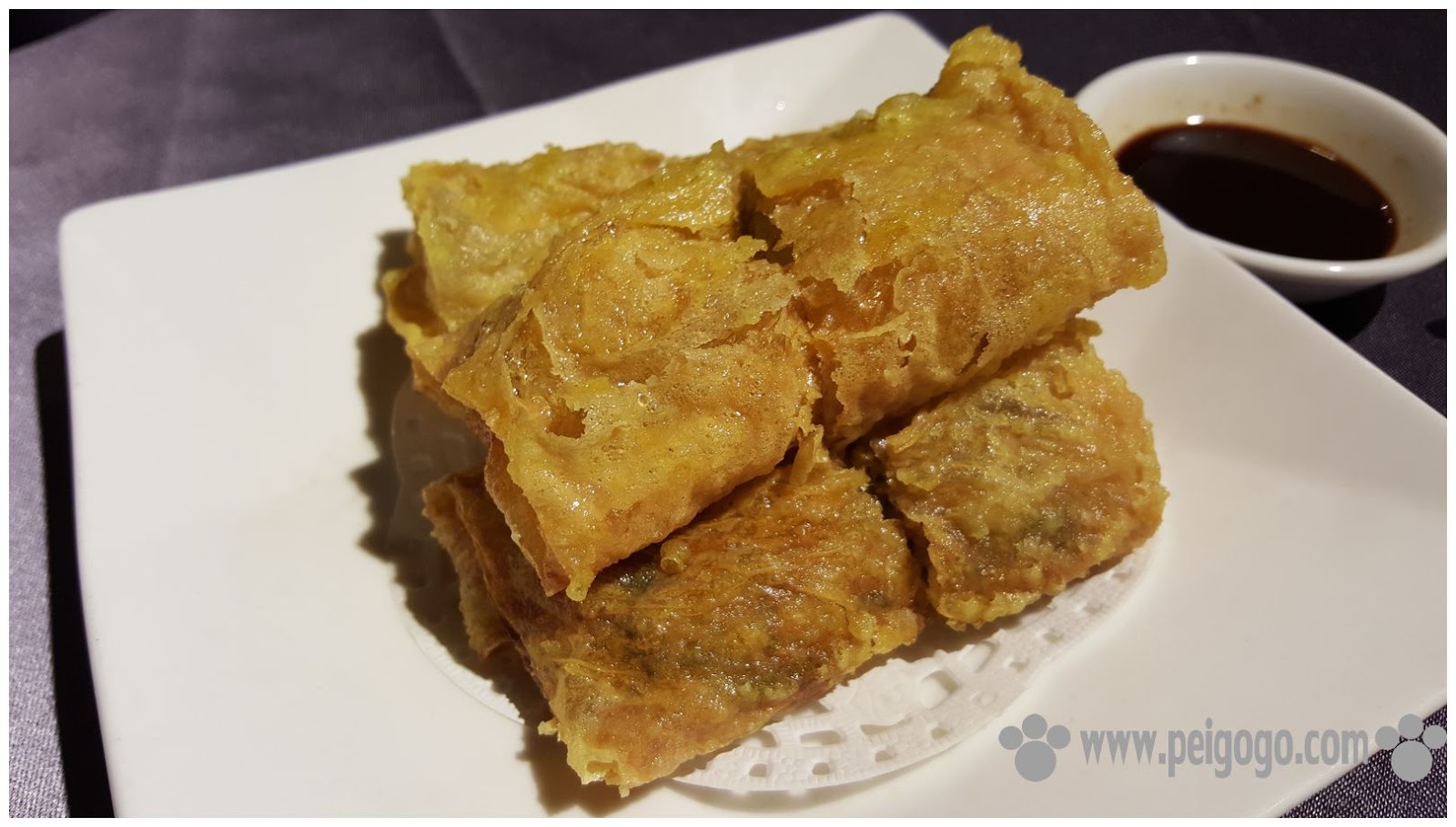 ▲鮮蝦腐皮捲,首先先介紹港點,鮮蝦腐皮捲是江狗狗與吳沛沛每次到港式餐廳都會點的一道菜,吃了它我們就可以給這家港點評分,兆品酒店的腐皮捲我們很喜歡,這就知道我們對它的評價了,外皮酥香沾上醬汁,把這道港點提升到另一個層次,並不會很油膩,可以說是還蠻成功的一道小點。