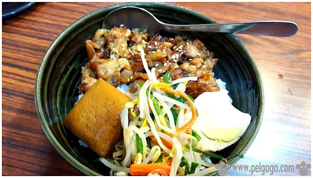 ▲招牌烤肉飯($85),江狗狗腦波很弱的點了這道,因為在丼飯內價格最高的,上來之後上頭的配菜其實有一些失望,要是這樣不如上層用肉肉填滿整個碗,豆干及豆芽菜都還好,肉的味道也沒有特別驚豔。
